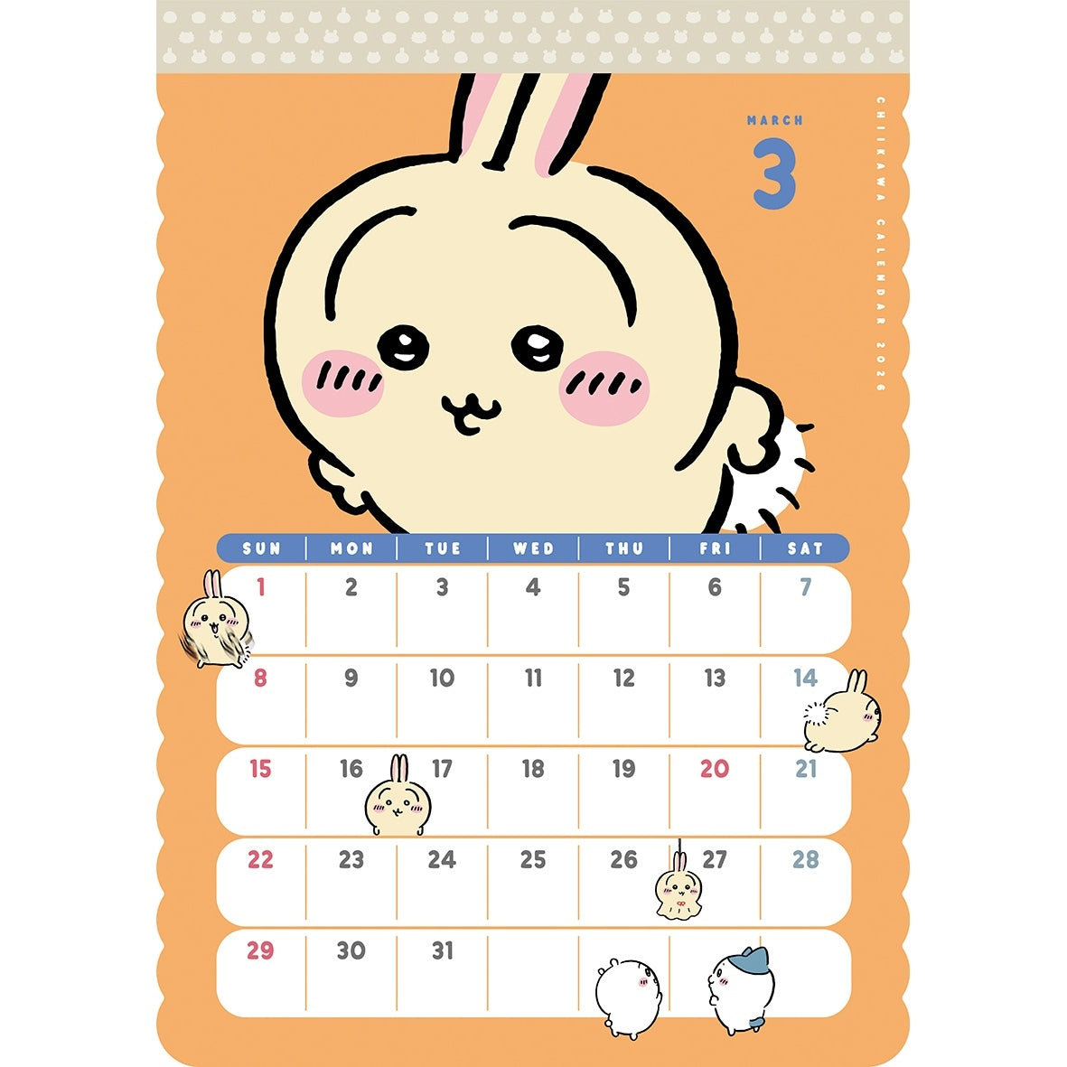 吉伊卡哇的2026年版挂历。装饰每个月的是吉伊卡哇、哈奇喵、乌萨奇等个性丰富的伙伴们可爱的表情!周围是可爱的浮雕图案。